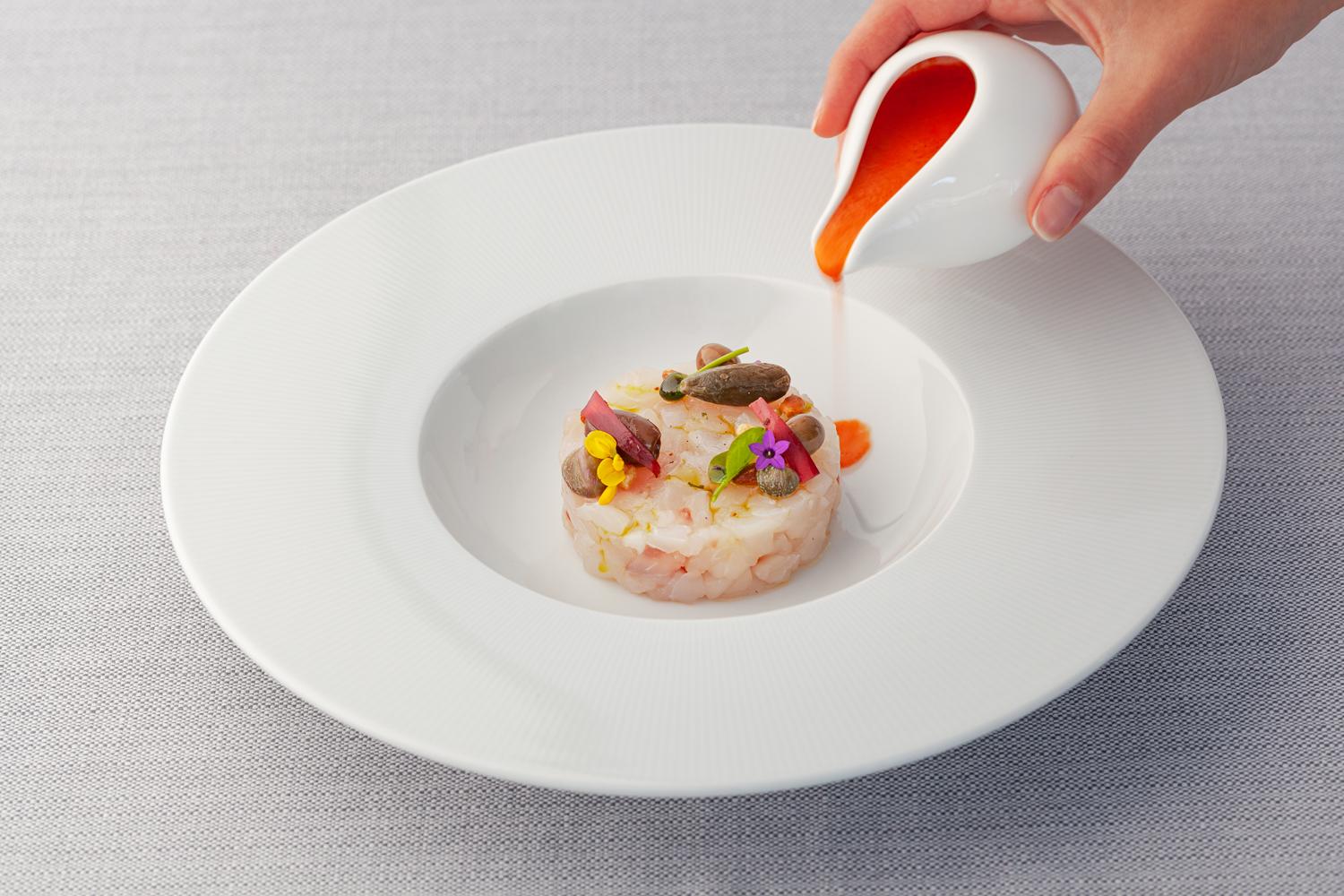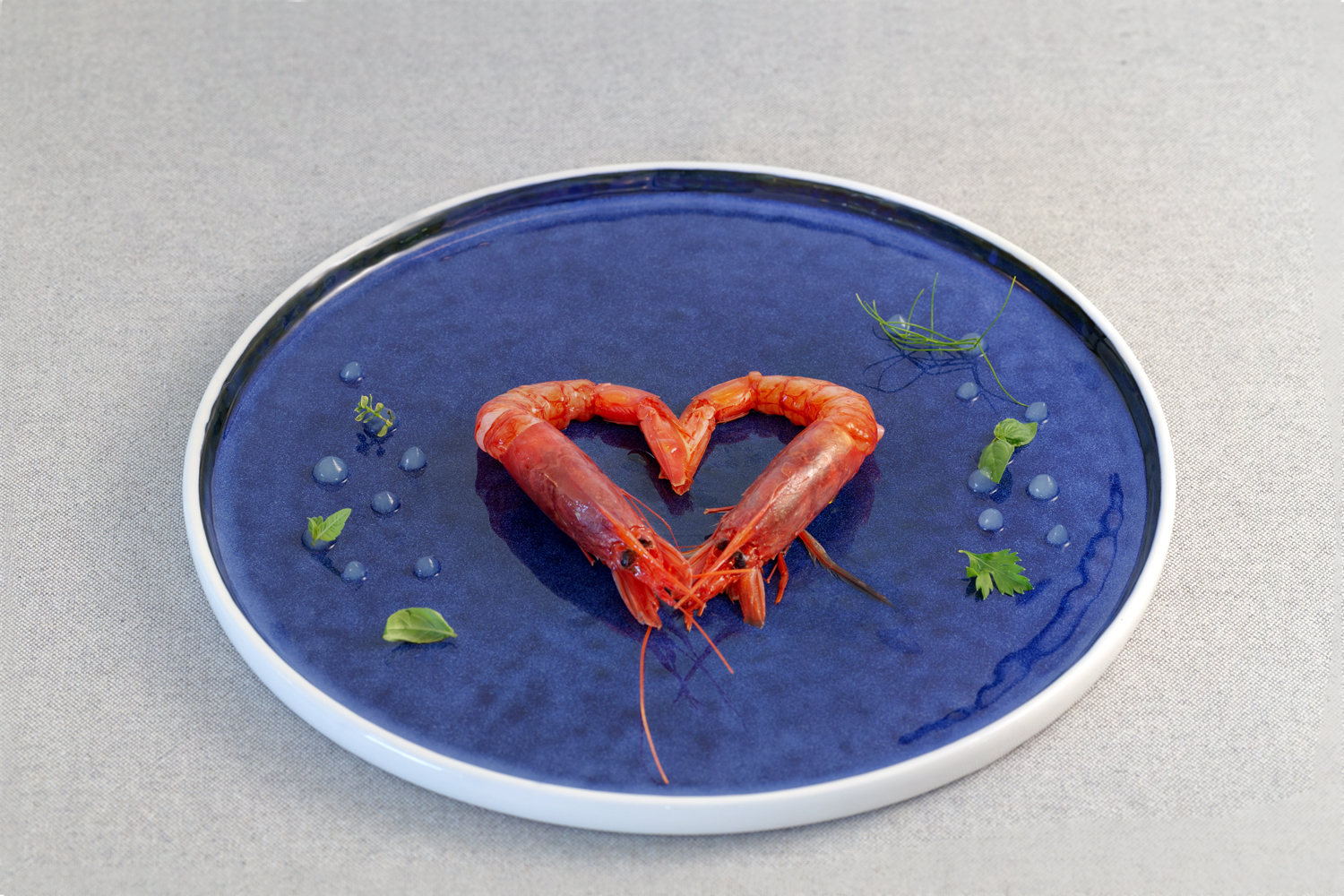 - Serve in a bowl starting with the chilled soup, add the red prawns, tiger shrimp, berries and garnish with small basil leaves.