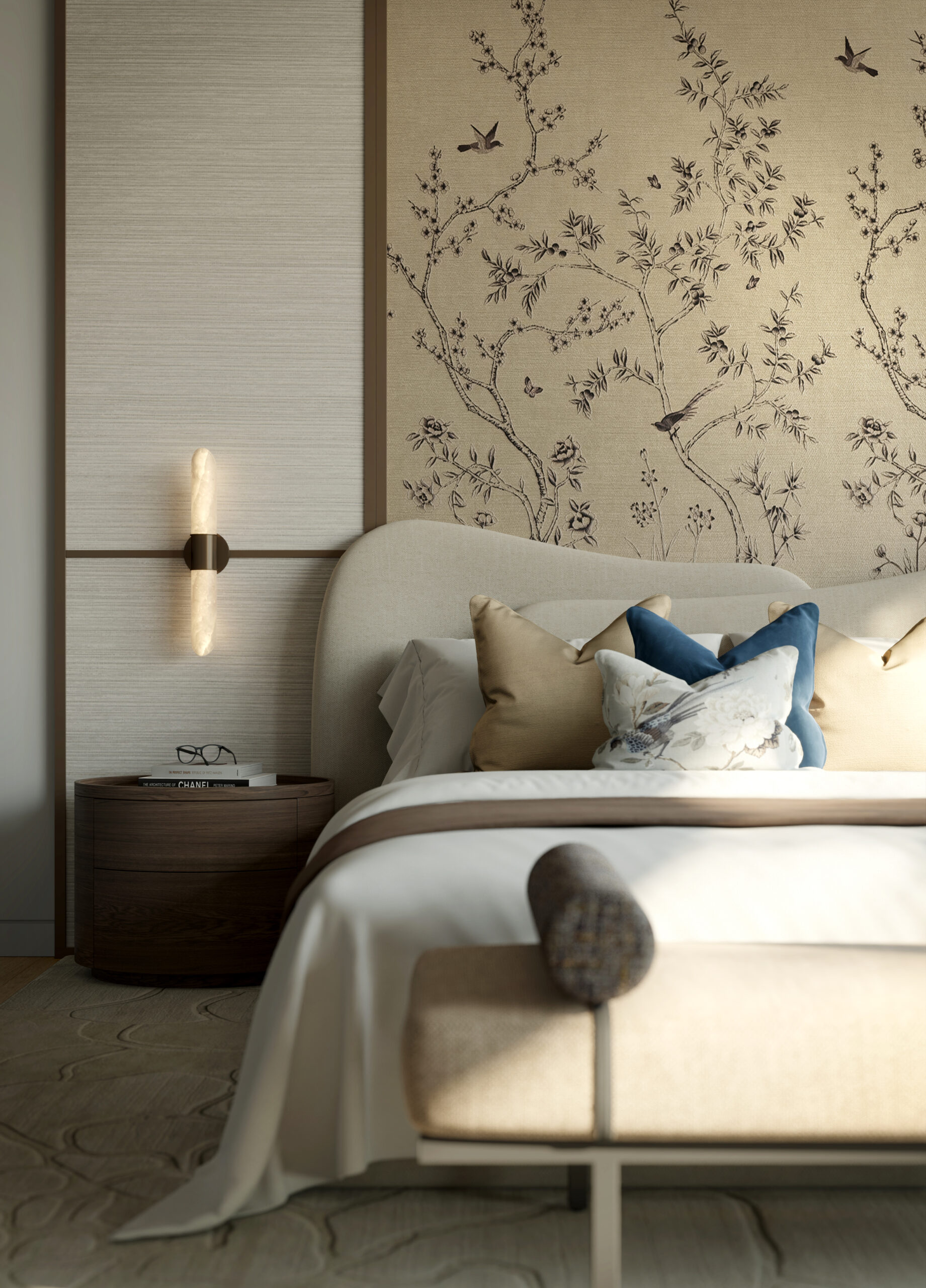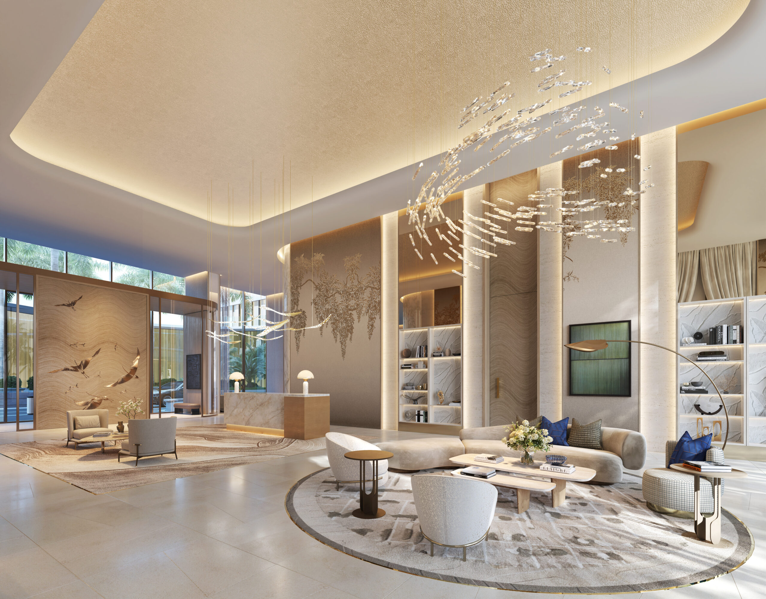 Each residence is furnished with bespoke motifs, showcasing grand chandeliers, subtly veined marbles, floor-to-ceiling windows and carefully curated lighting which sets the tone for the grandeur that can be found in each home. The open living spaces blend seamlessly into exquisite kitchens designed for the most discerning hosts while master suites house an