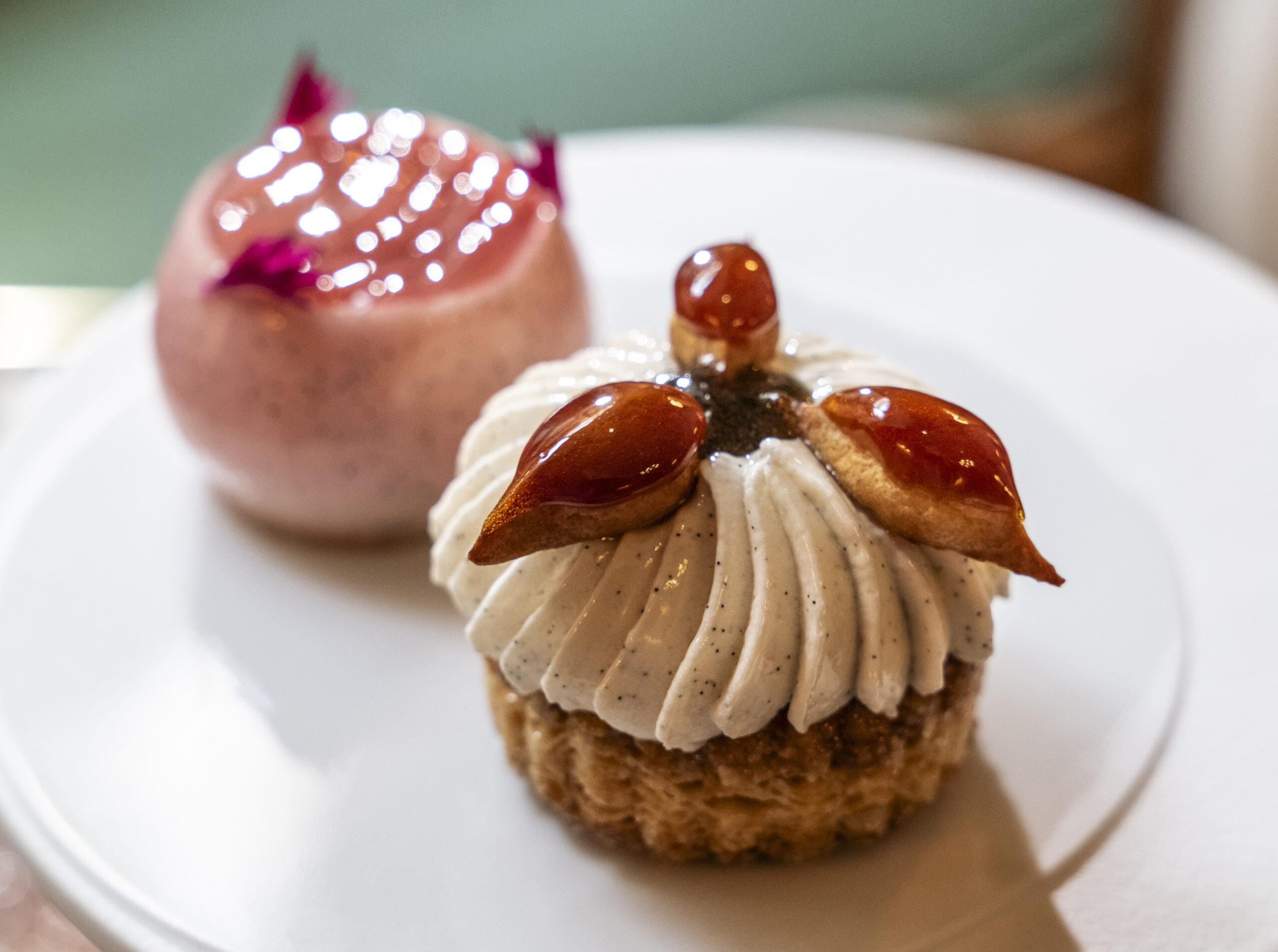 Three Acts: Savory bites, pre-dessert, and a selection of pastries, served with a glass of champagne or a sparkling alcohol-free alternative.