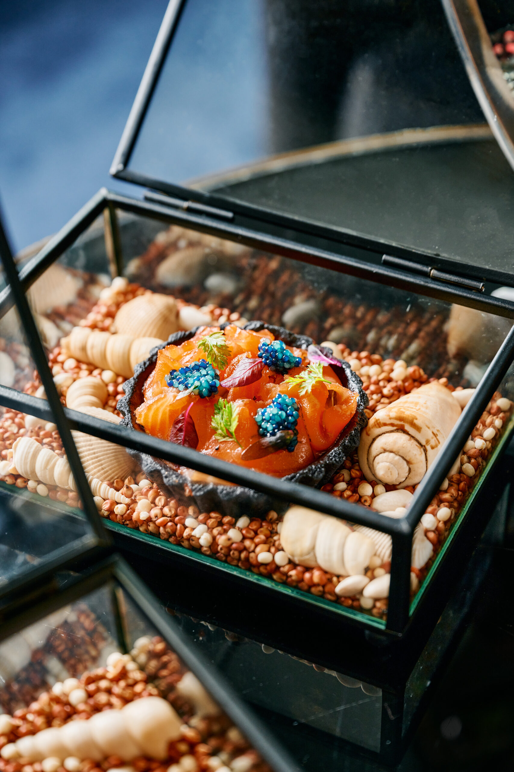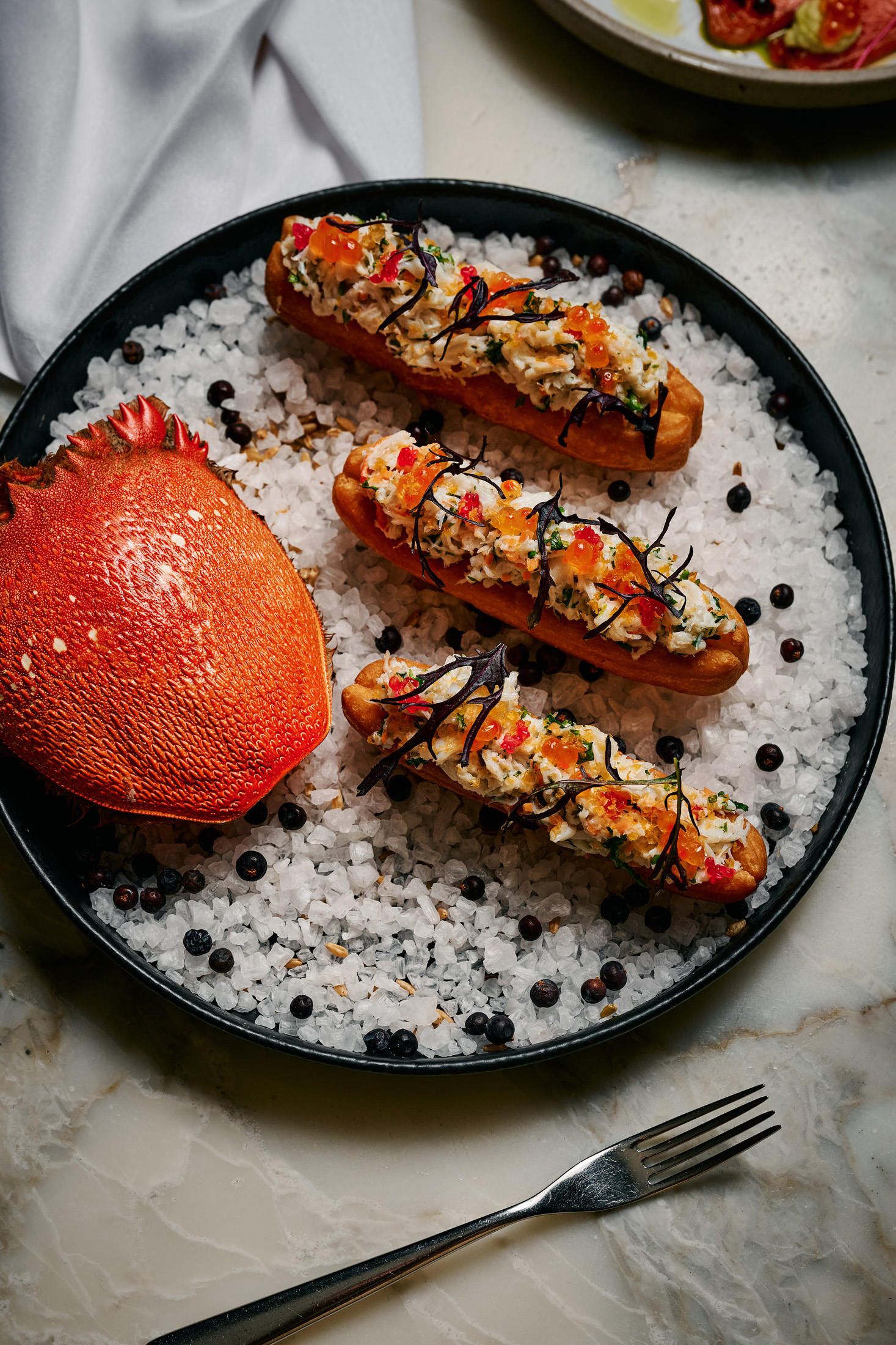 - Next assemble the finger lime pearls across the crab, randomly so that every bite can get some of the pearls, you may also ad the salmon roe if you like in a similar fashion.