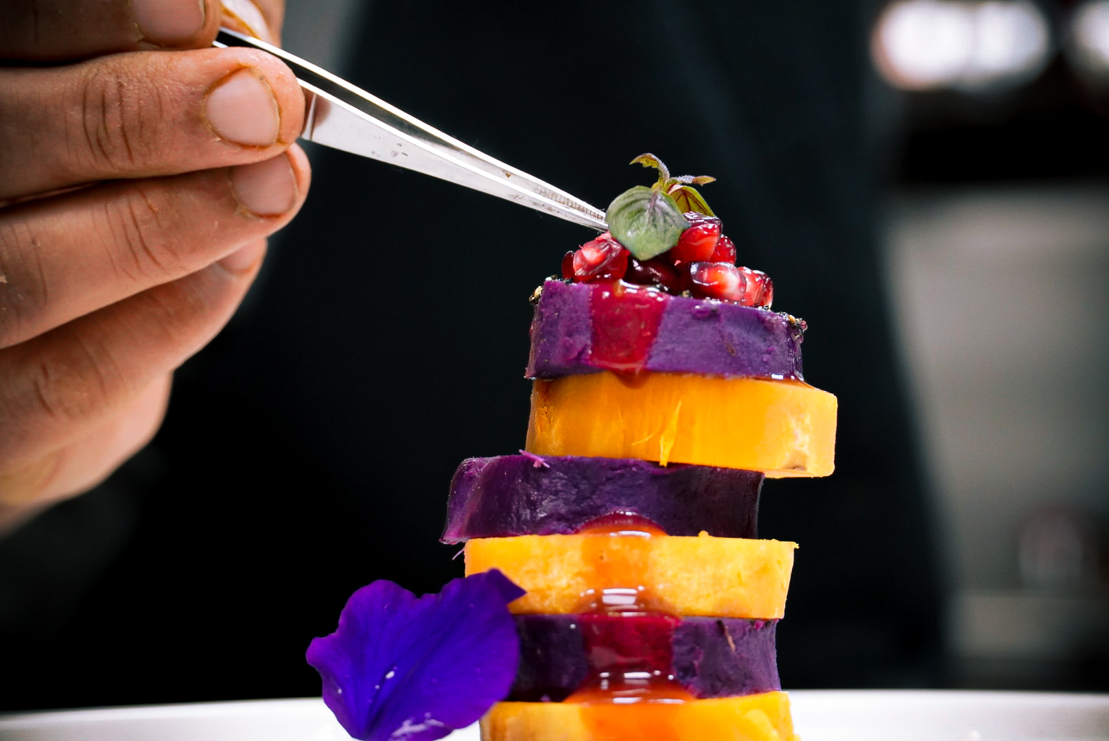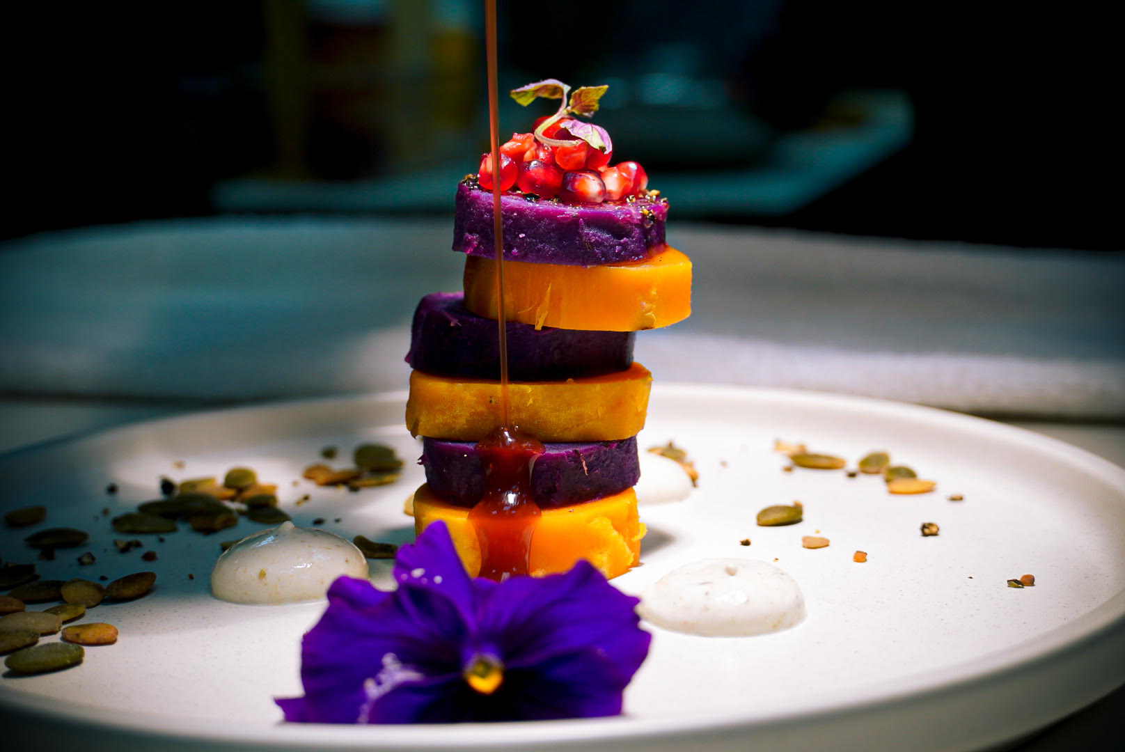 - For plating, stack the marinated sweet potato slices one on top of another alternating the both colors of sweet potato. Put a few dollops of yogurt around the sweet potato and pour the pomegranate reduction on top of the sweet potato stack.