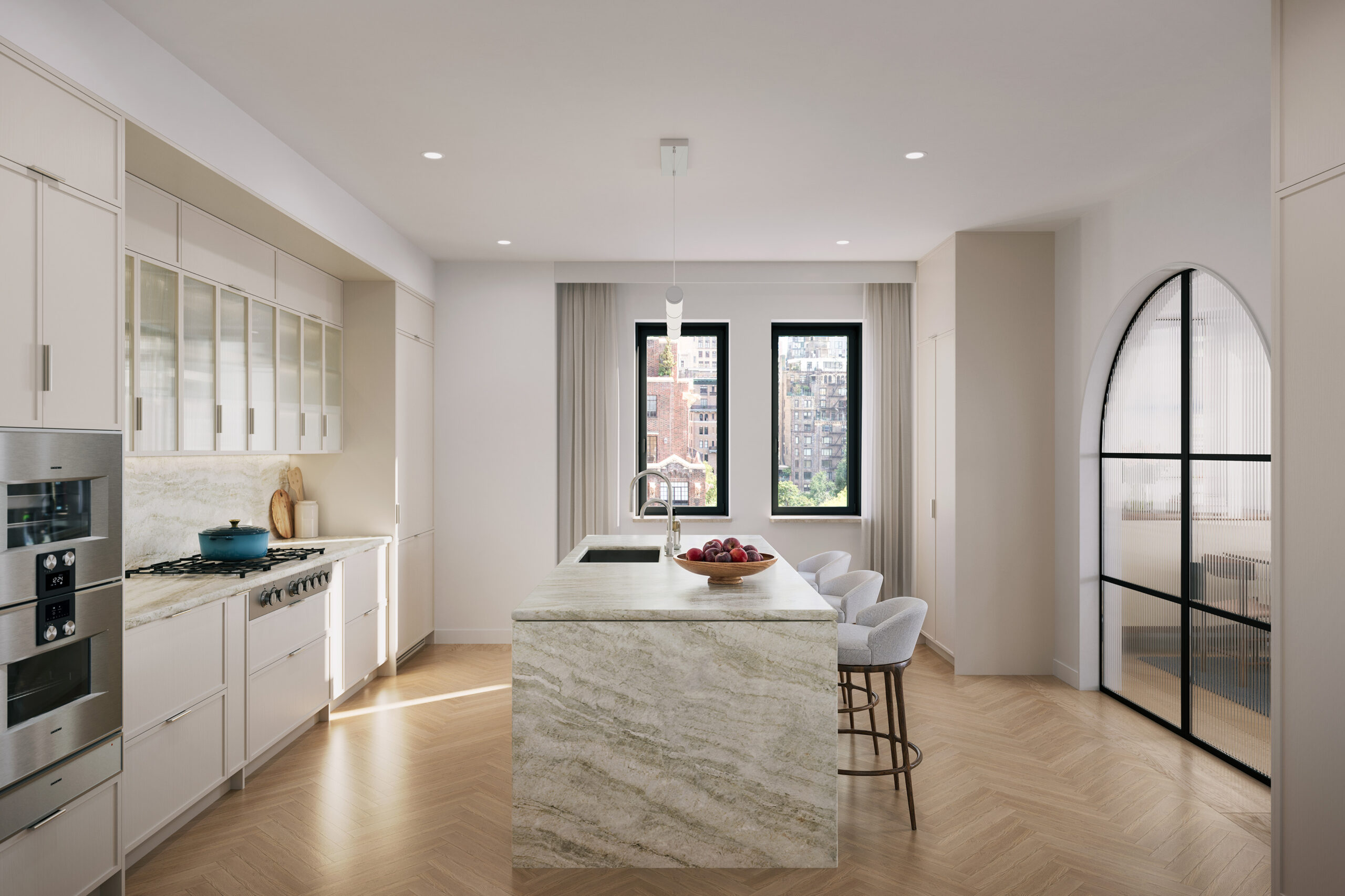 The residences themselves, also designed by Morris Adjmi Architects, are designed with a “jewel box” sensibility, emphasizing proportion and craftsmanship. Think: great rooms with up to 11’5” ceilings, European white oak-herringbone floors with brass inlays, and custom arched dry bar clad in oak and Sequoia Brown stone. The kitchens are a culinary centerpiece with custom profiled cabinetry, Madreperola quartzite waterfall-edge islands, state-of-the-art Gaggenau appliances, while arched steel pocket doors allow for an elegantly cordoned-off entertaining space. The primary suites are restorative retreats complete with marble-clad bathrooms,freestanding soaking tubs,heated flooring, and exquisite Dornbracht fixtures. The sponsor and marketing team purposely designed the living spaces to allow for future flexibility, so the formal dining area can be flipped into a larger eat-in-kitchen and the fourth bedroom into a library.
