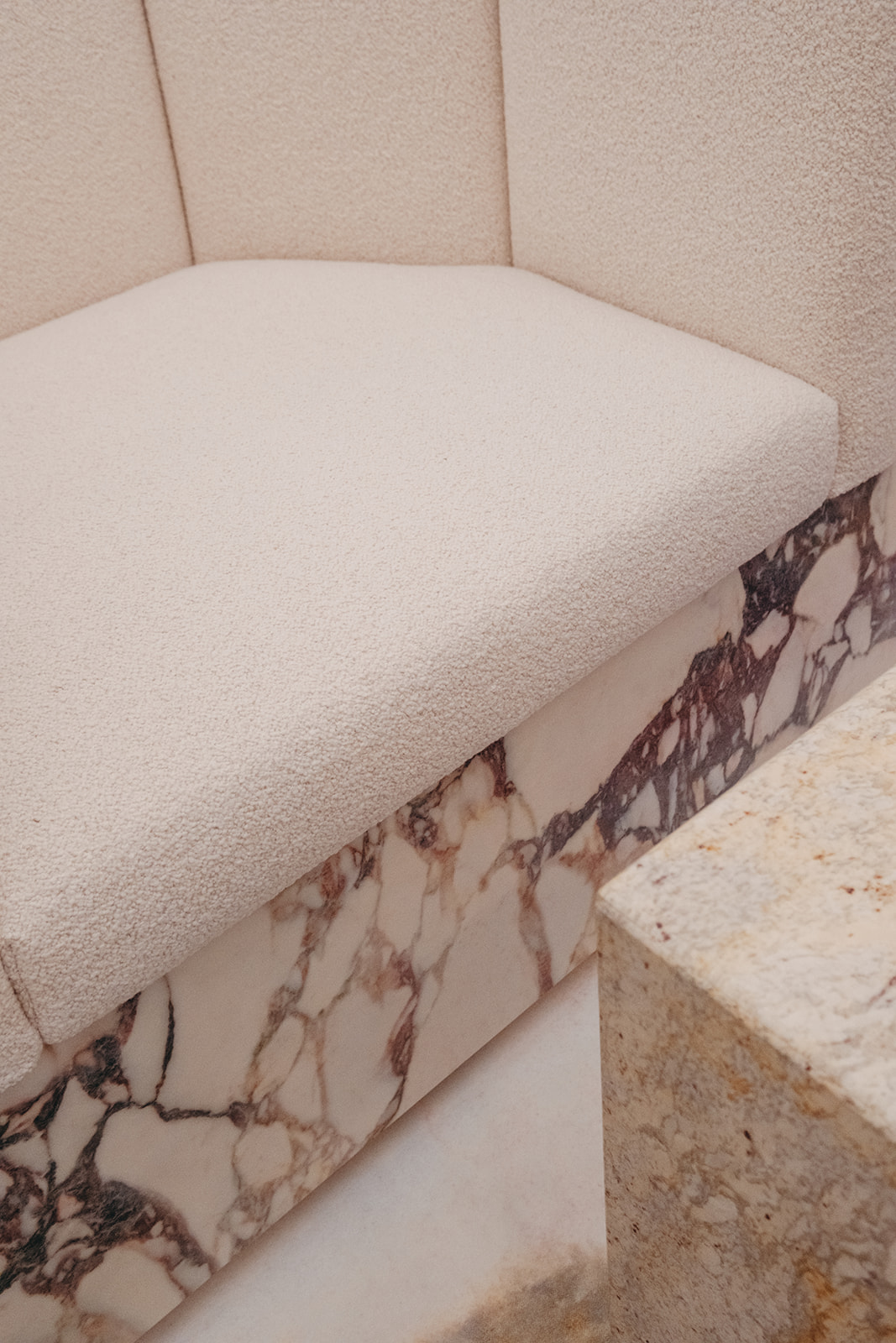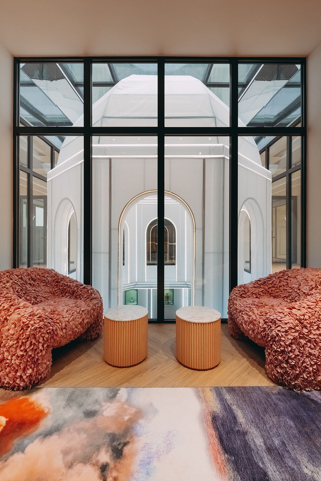 In the lobby, custom-made armchairs combine ceramic and bouclé fabric, harmonising with the airy textures and soft light of the dome. Bistro chairs from Kartell’s collections, upholstered in fabrics by Emilio Pucci, further enrich this universe. Their vibrant, acid-toned seats create a dialogue with the reinterpreted classical architectural elements.