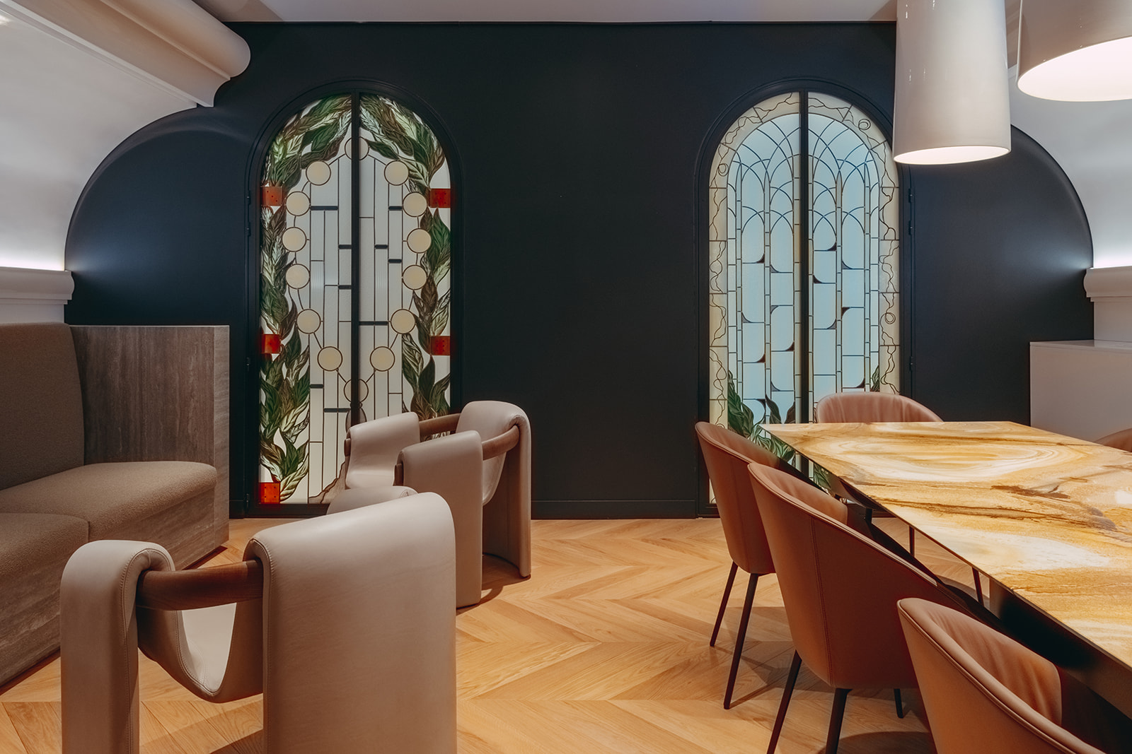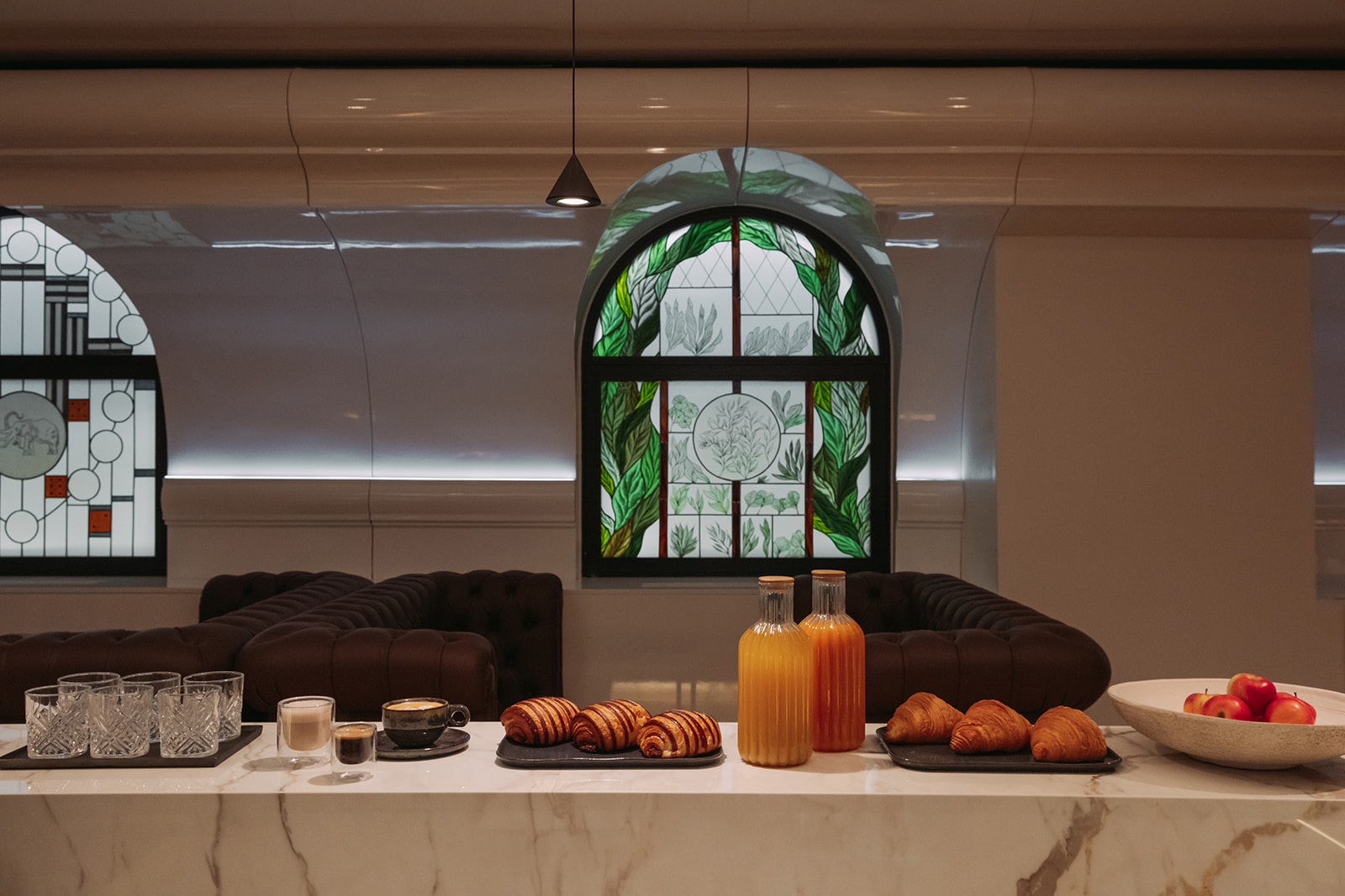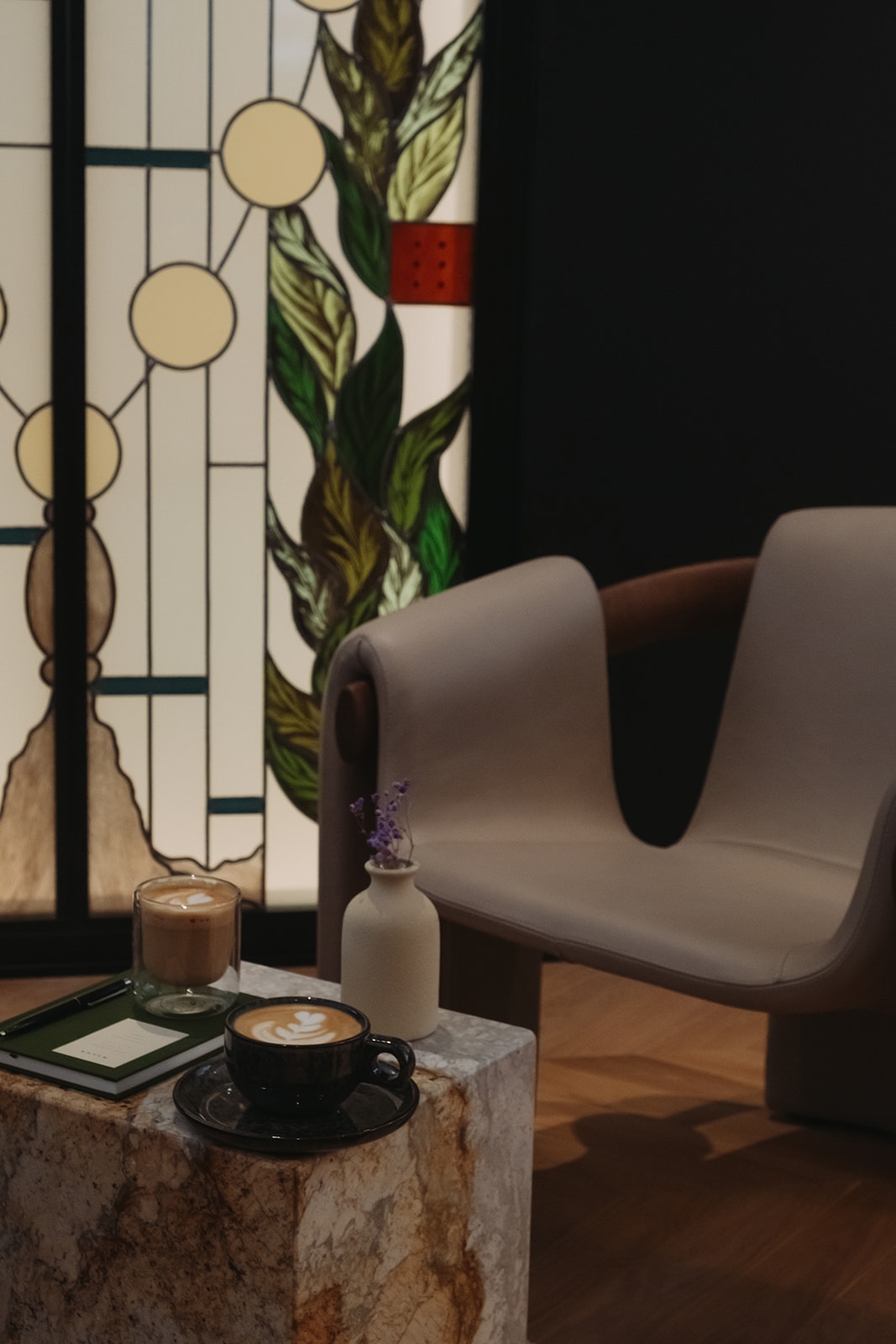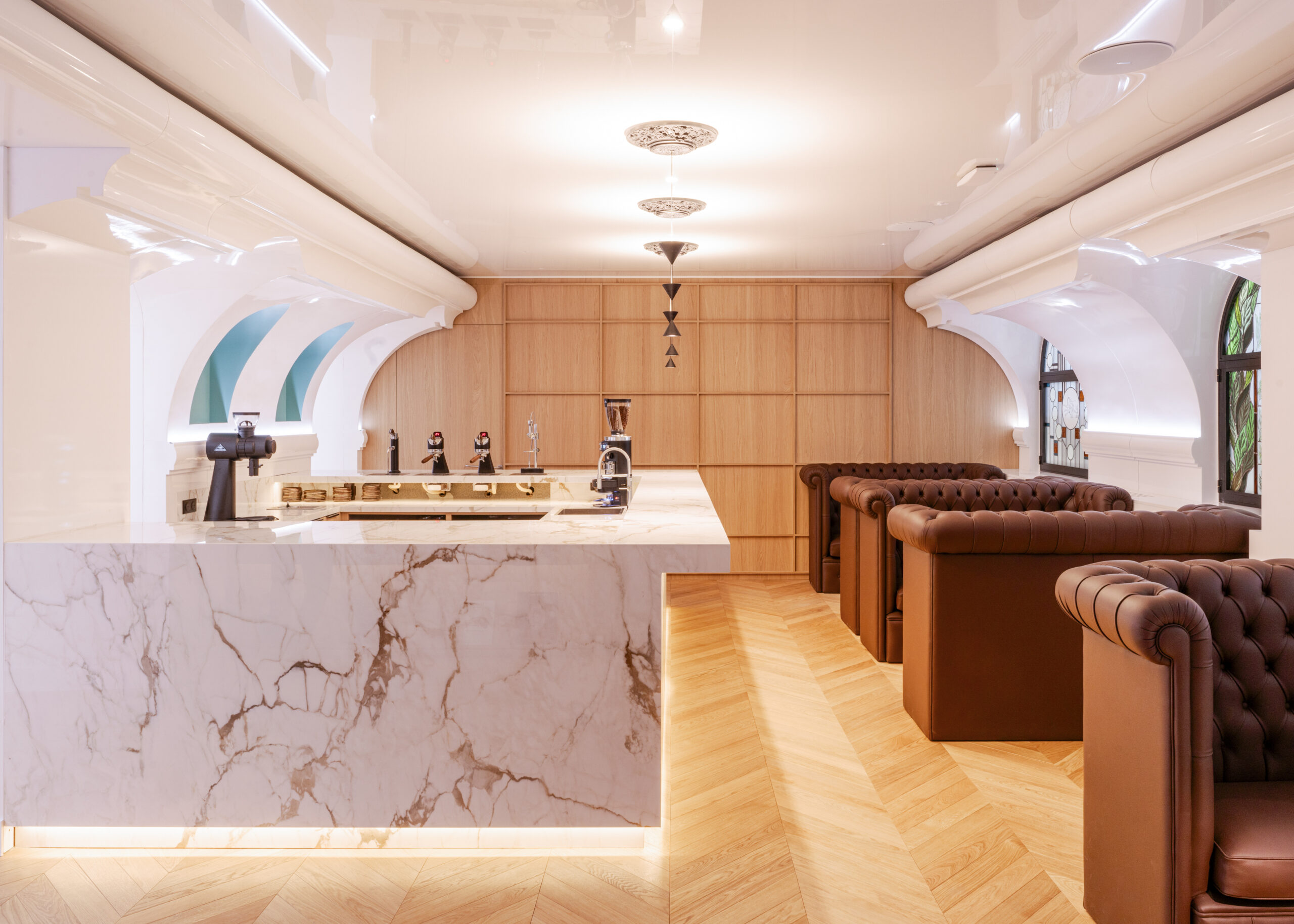This pursuit of balance continues in the barista area, where an atmosphere inspired by old boys’ clubs sets the tone. Custom-designed Chesterfield sofas create a warm and inviting setting. Stained glass windows, handcrafted by L’Âme du Vitrail, narrate the story of Kwerk’s various locations through a delicate interplay of light and colour, extending this poetic narrative.