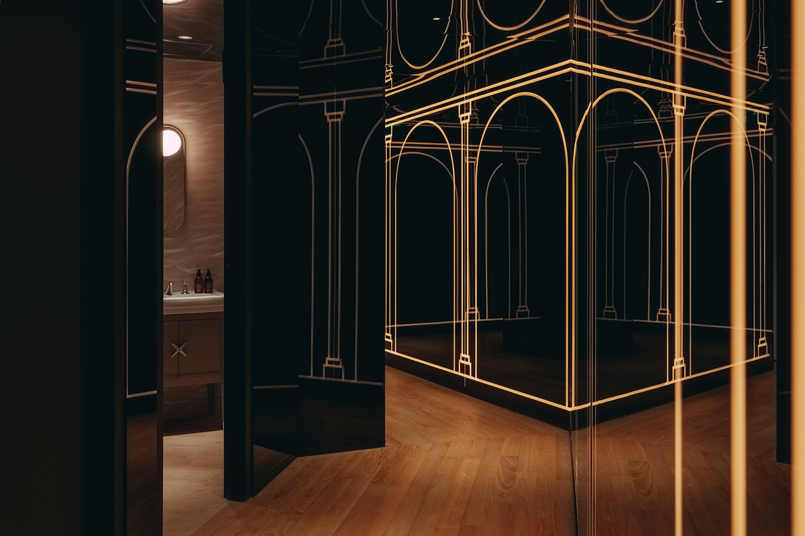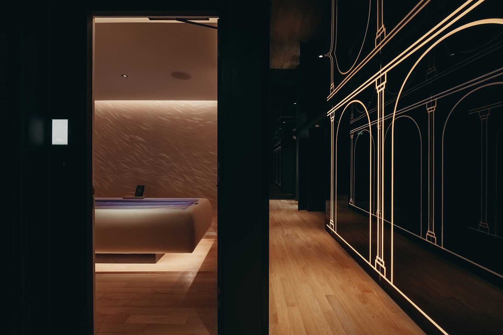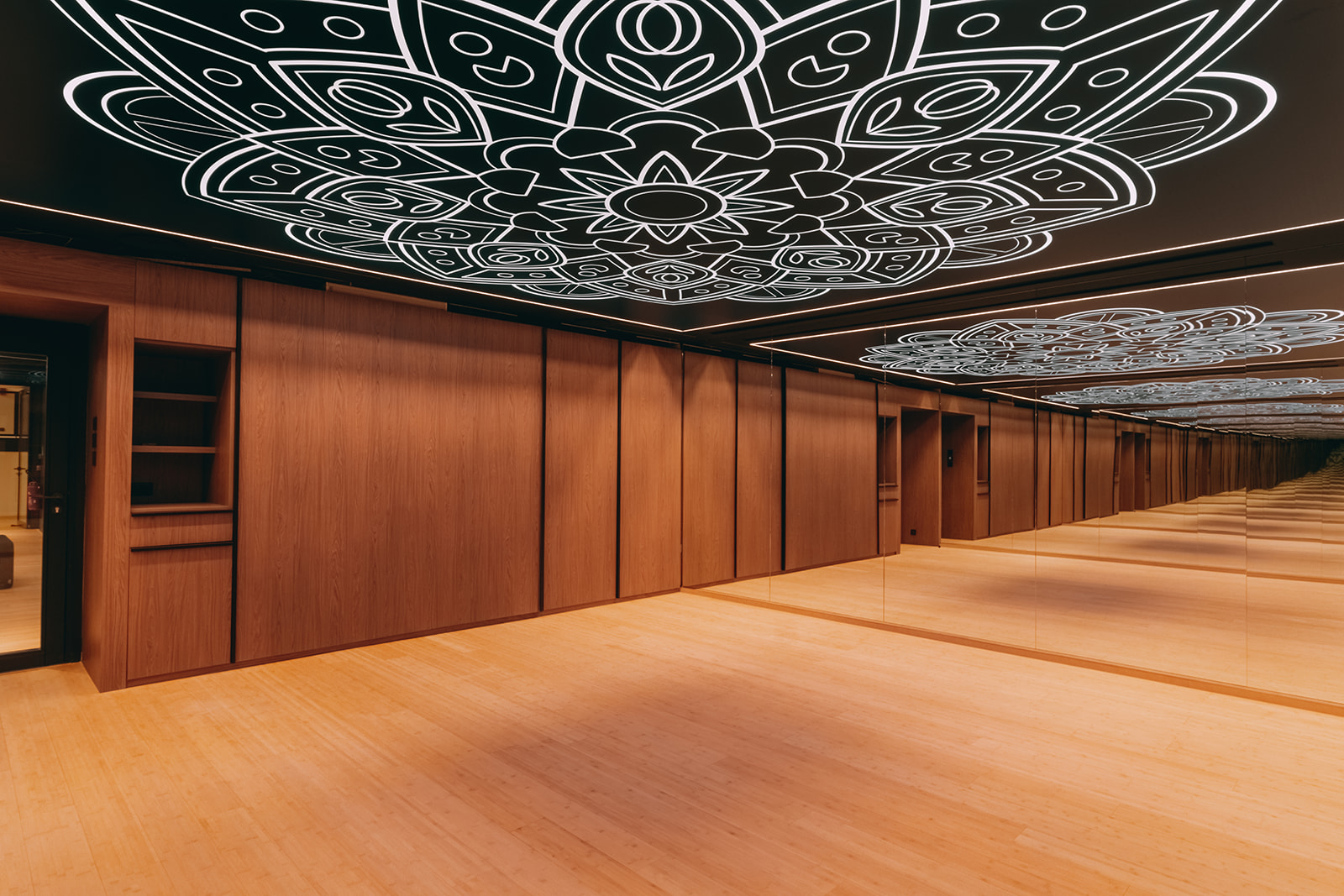 • The training studio is distinguished by its warm and inviting design, featuring luminous arches and solid wood walls that create a calming, sensory-driven atmosphere.