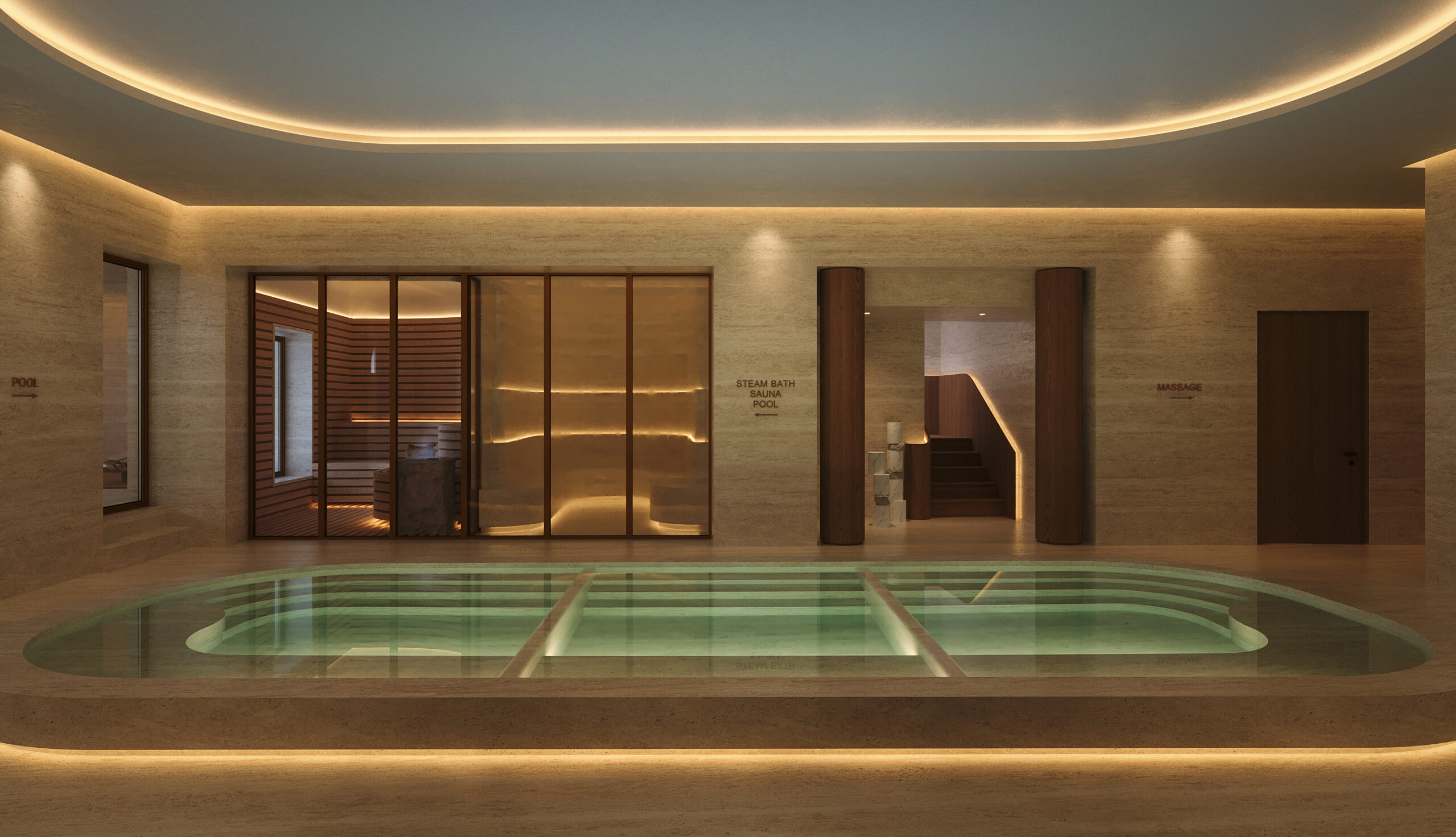 For the first time in Madrid, the residential development will introduce a hospitality-grade lifestyle designed as a natural extension of the home. Wellness amenities include a high-performance gym with functional training, boxing and pilates facilities, an indoor pool, a hydrotherapy circuit with sauna, steam room, jacuzzi, and three immersion pools (cold, warm, hot), alongside massage rooms and a beauty corner.