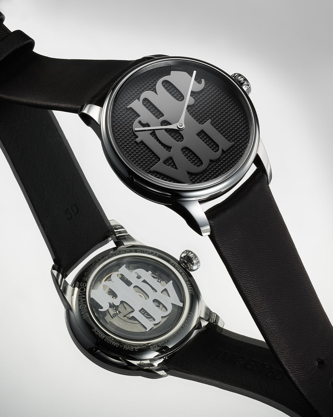The typography stands out against a matte Clou de Paris dial, creating texture and depth. The guilloché pattern, a classic of traditional watchmaking, nods to Bonvicini’s universe, where nails, leather, and black recur throughout her work. Rhodium-plated, tapered hands cut across the dial, emphasizing the message as if it were a sculpture.