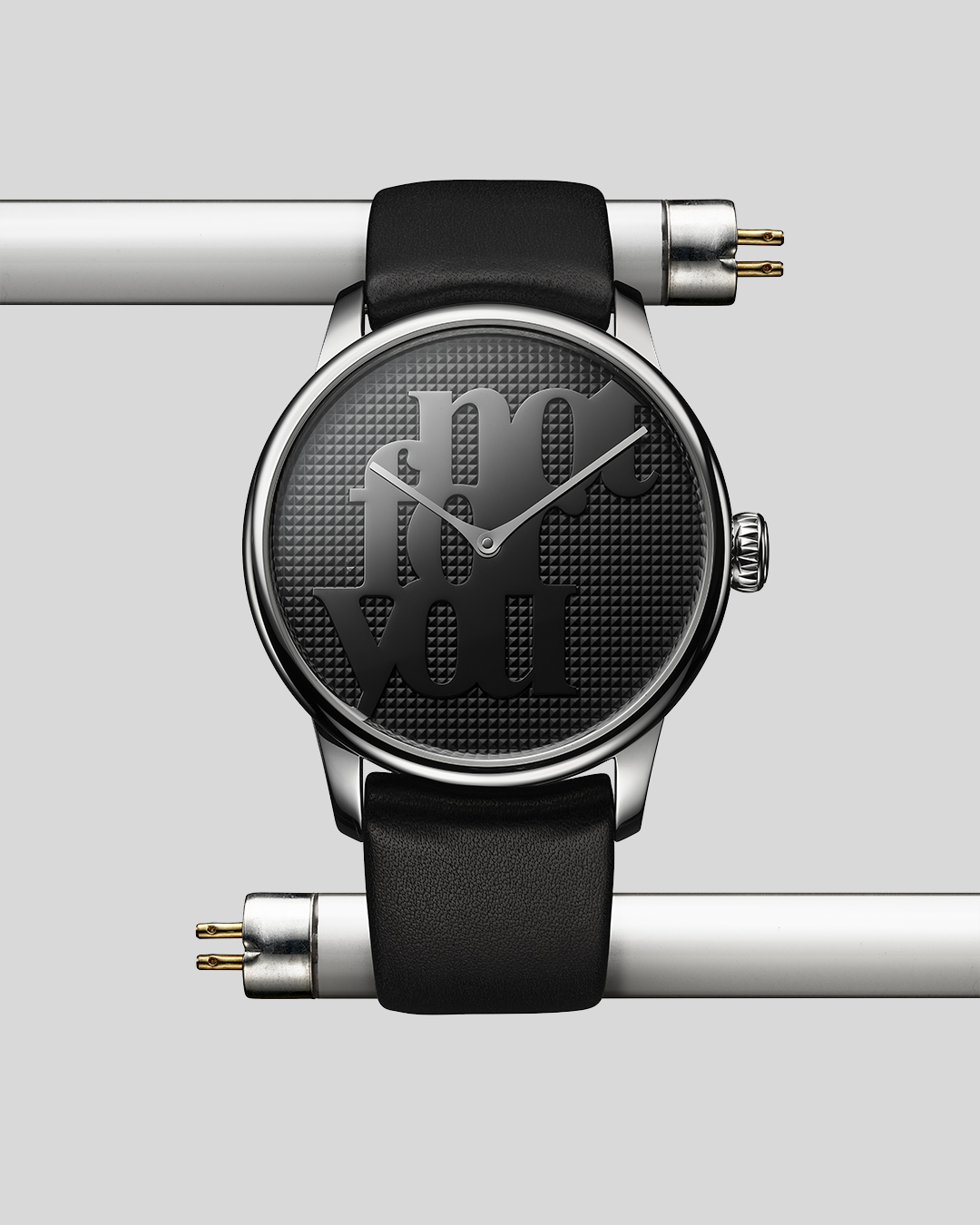 The Louis Erard team captured the spirit of “not for you”, translating the artist’s signature codes through black, steel, and leather. “not for you” is a bold statement. It challenges us to reflect on our relationship with others. Since 2006, Bonvicini has displayed it on walls in neon or mirror letters, simultaneously confronting and rejecting the viewer. “I love her architectural language in three dimensions. The way she turns text, words, and slogans into sculptural objects that express strong opinions and feminist critique. In the same way, an artist watch is first and foremost a three-dimensional sculptural object. With our watches, we try to create a language, an architecture.”