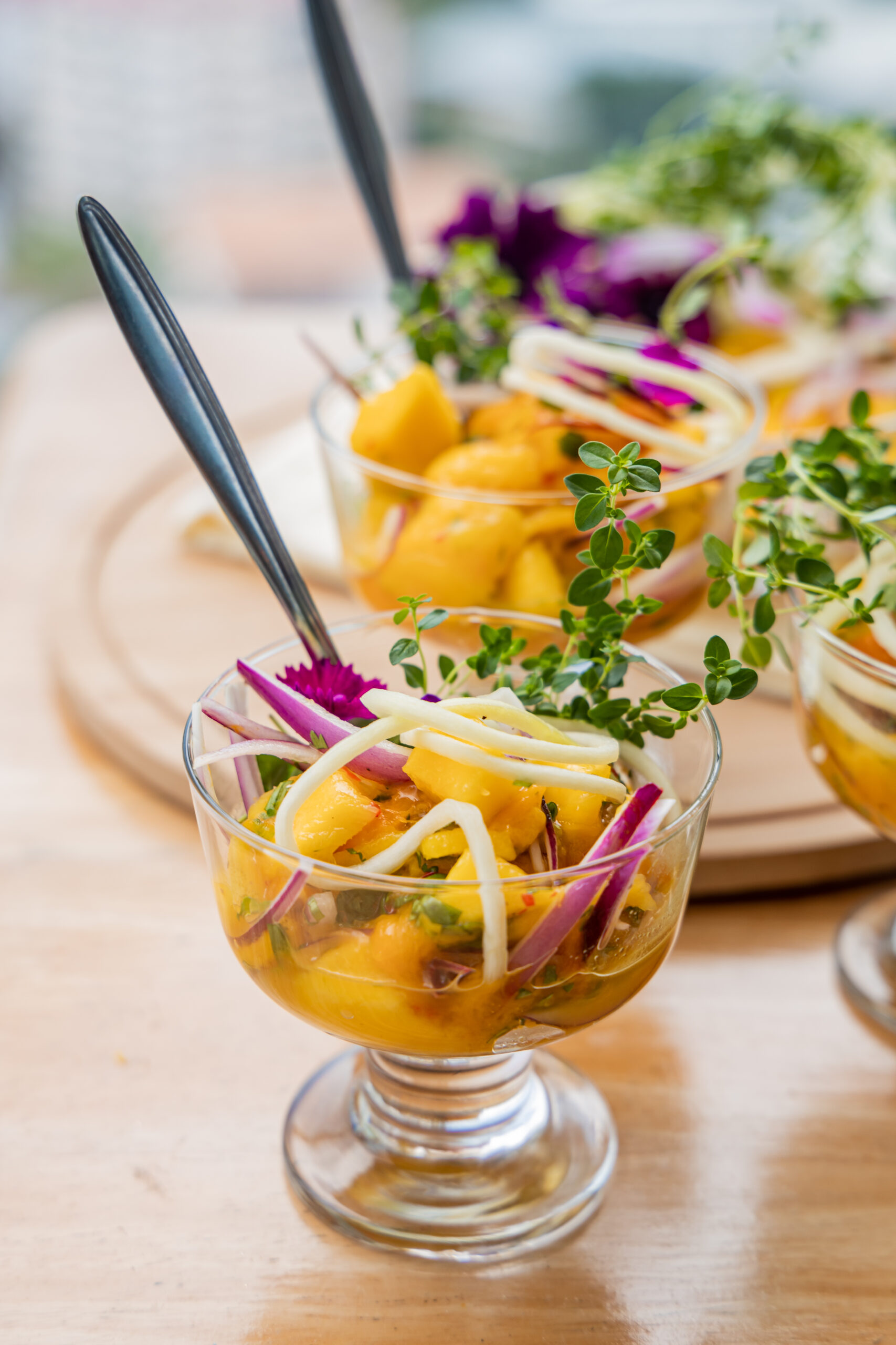- Refrigerate the salad in an airtight container for three hours, then serve in glasses and garnish as desired with green plantain chips (fried), edible flowers, and hydroponic thyme micro greens.