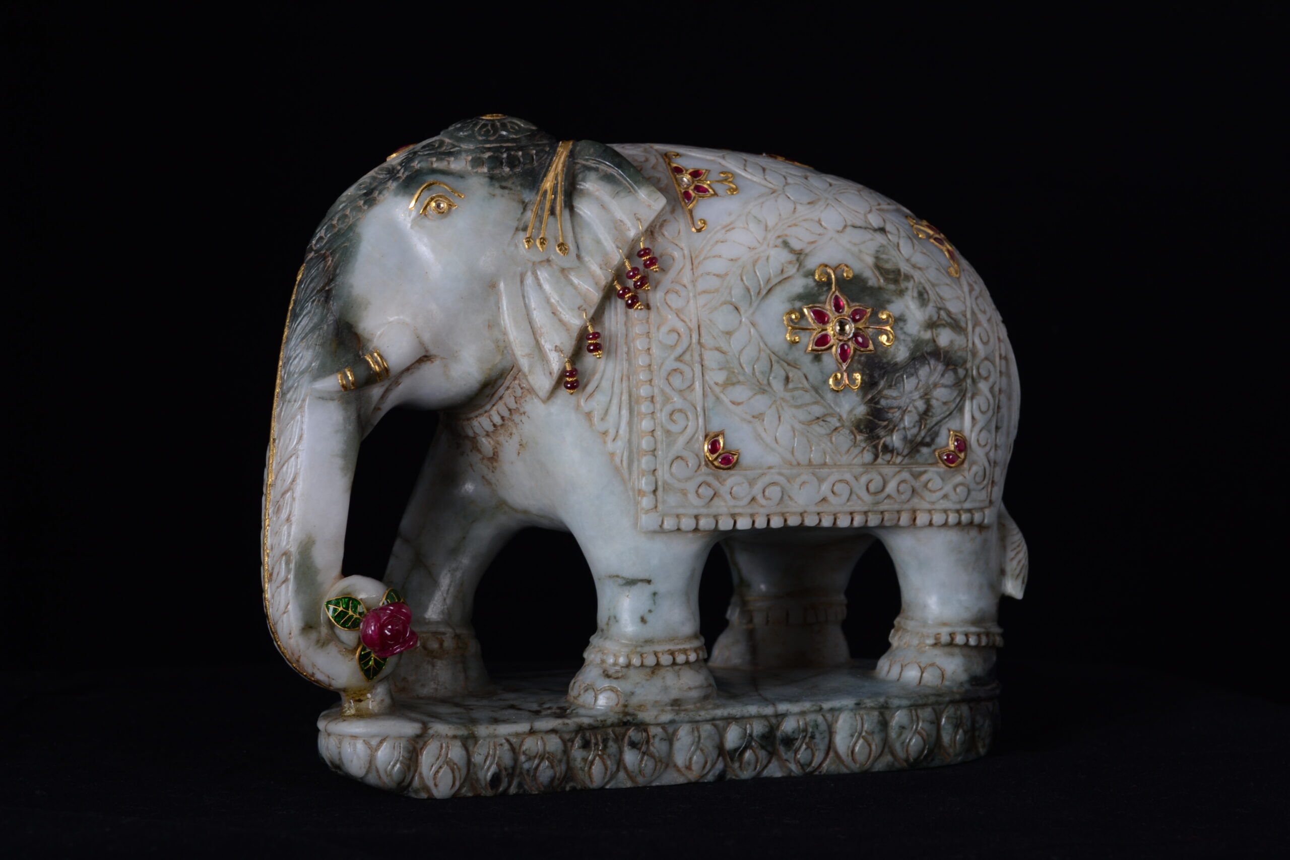 This antique jade elephant is a masterpiece of craftsmanship, adorned with gold work and studded with rubies and diamonds. Holding a ruby rose delicately in its trunk, the elephant likely symbolizes love and affection. Such a piece was often a gift of profound meaning, representing the giver’s admiration and deep emotions for the recipient. The use of precious stones and gold highlights its importance, suggesting it was a cherished token of love, perhaps given on a significant occasion or as an eternal reminder of affection.