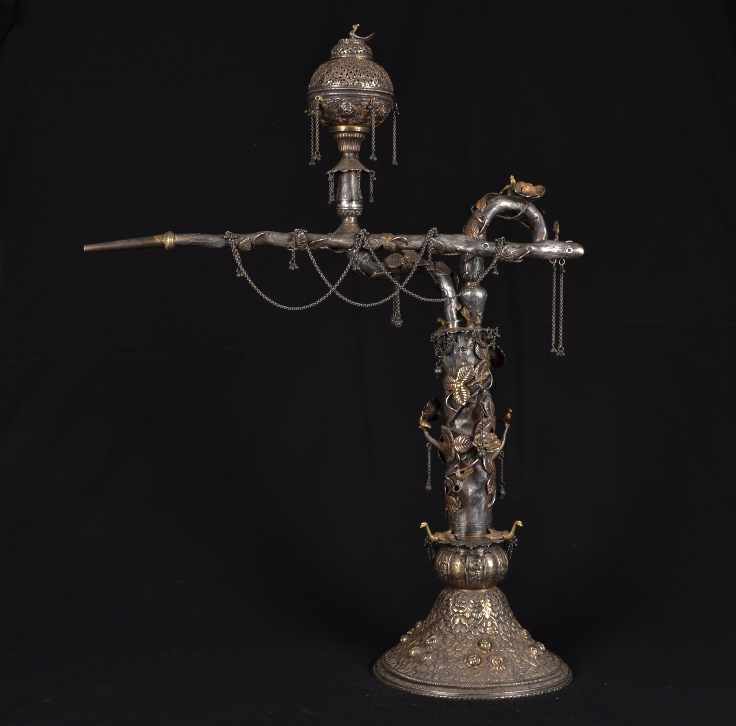 This ornate hookah is a delicate and lightweight piece, symbolizing the feminine version of traditional smoking apparatuses. Adorned with intricate embellishments and floral motifs, it reflects the elegance suited for women. In traditional Indian households where the purdah system was observed, women often stayed within the domestic sphere, and smoking tobacco was a common cultural practice. Such hookahs were gifted by the men of the house to the women, not only as functional items but also as tokens of affection and care. These beautifully crafted hookahs were both a utility and a statement of the giver’s regard for the recipient.