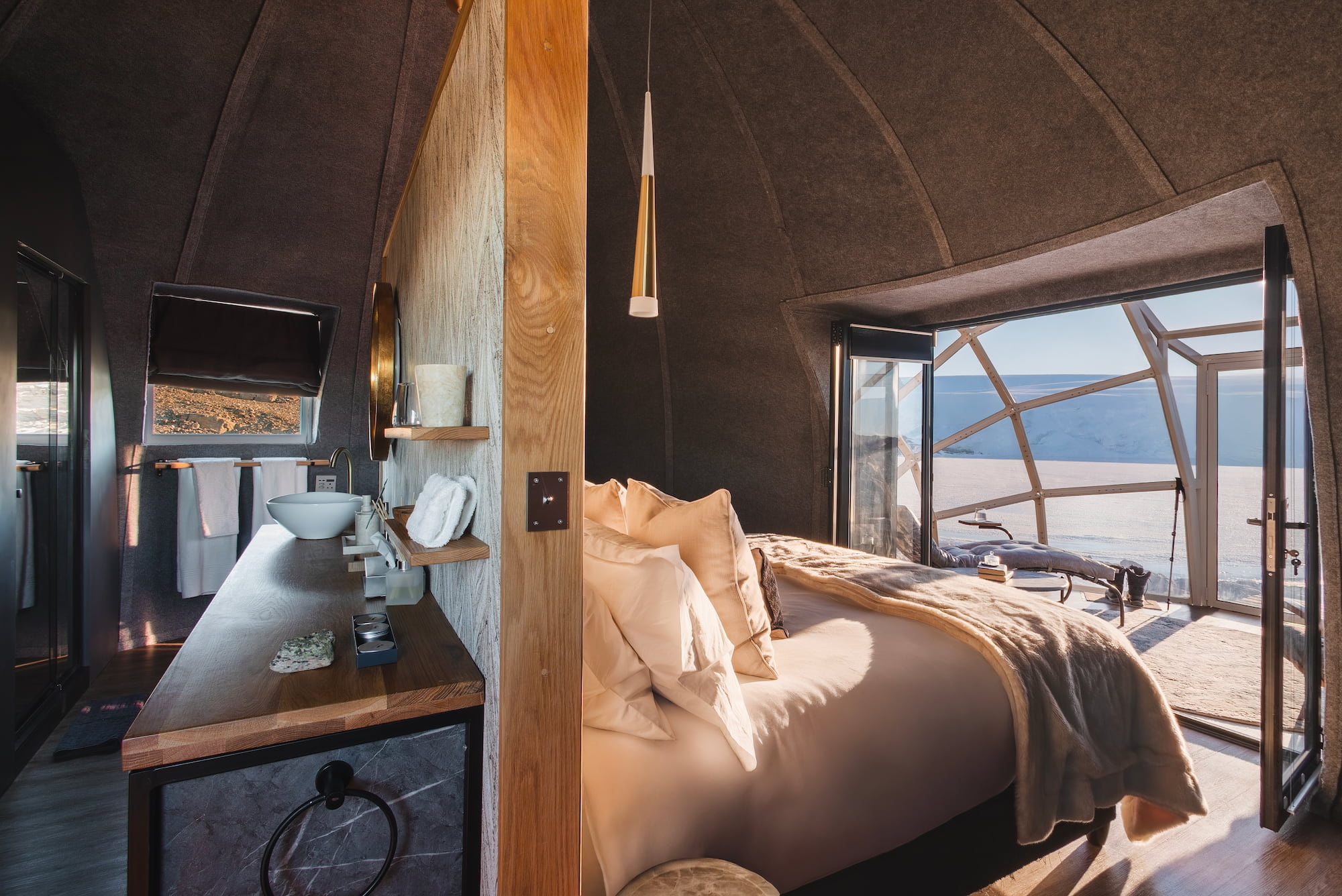 For those who seek the authentic pulse of discovery, the relaunched Explorer Camp offers a tactile connection to White Desert’s expeditionary roots. Positioned beneath the watchful rise of T-Rex Mountain, the camp embraces a “polar adventure meets Alpine-chalet” aesthetic.