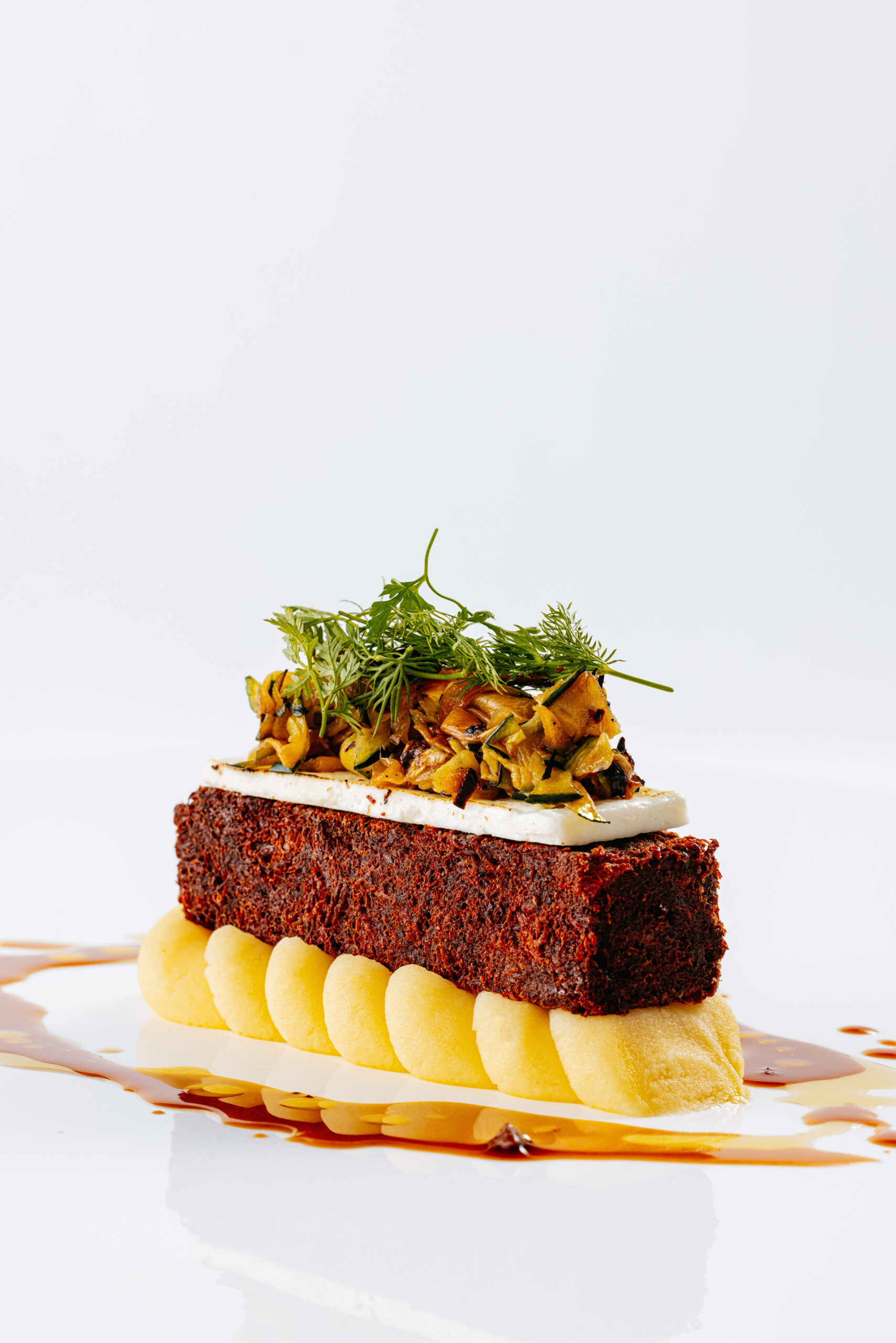 Solomillo al Josper – Grilled beef tenderloin, creamed kale, romesco, potato terrine, salsa verde, jus