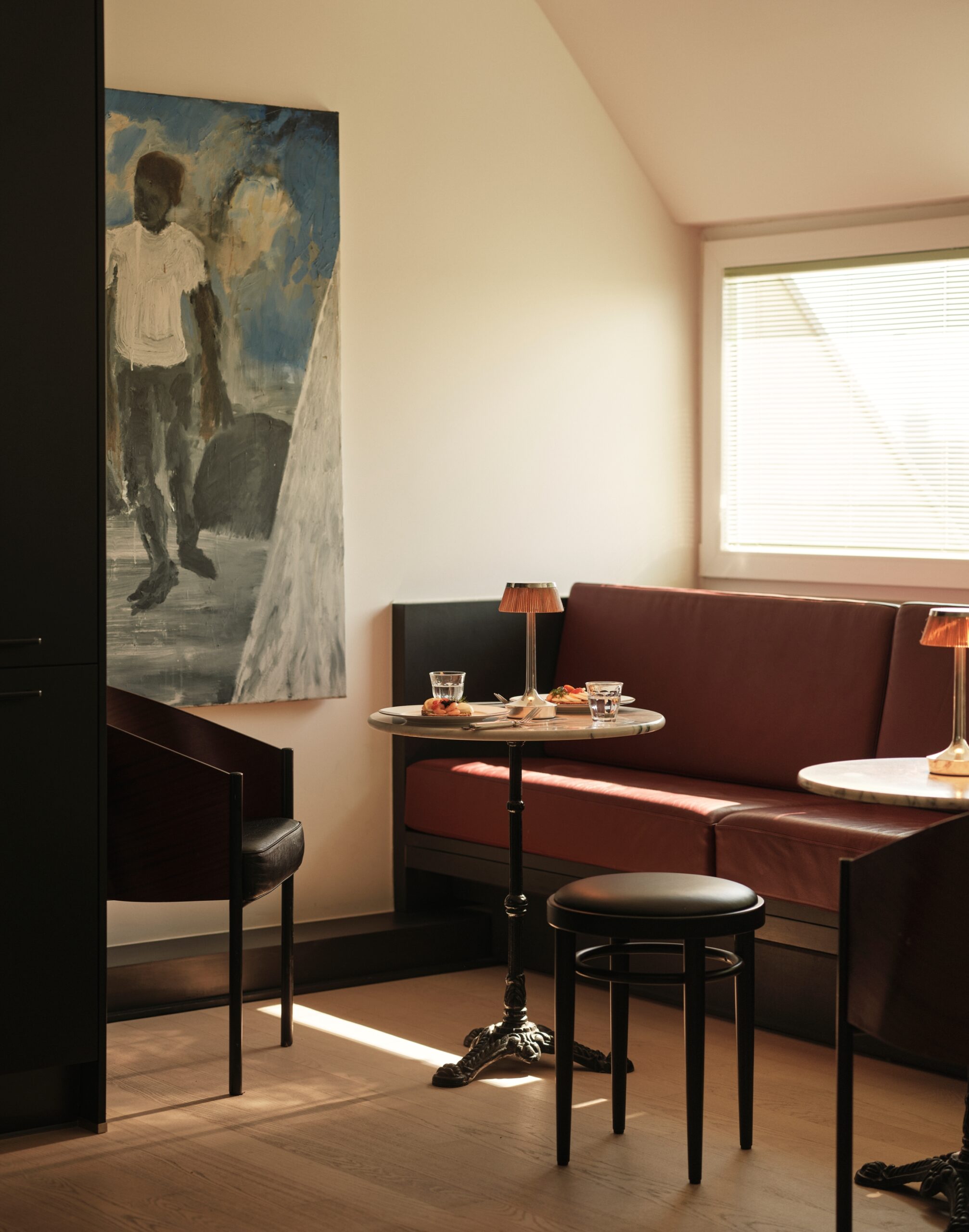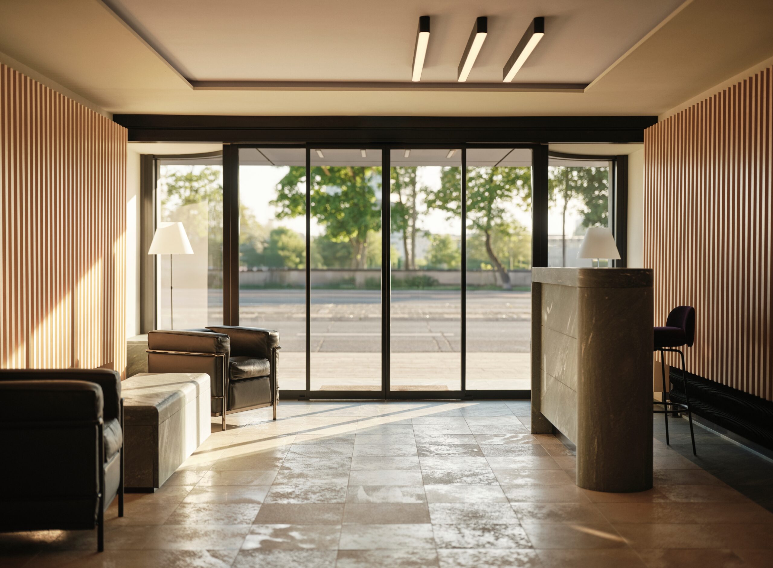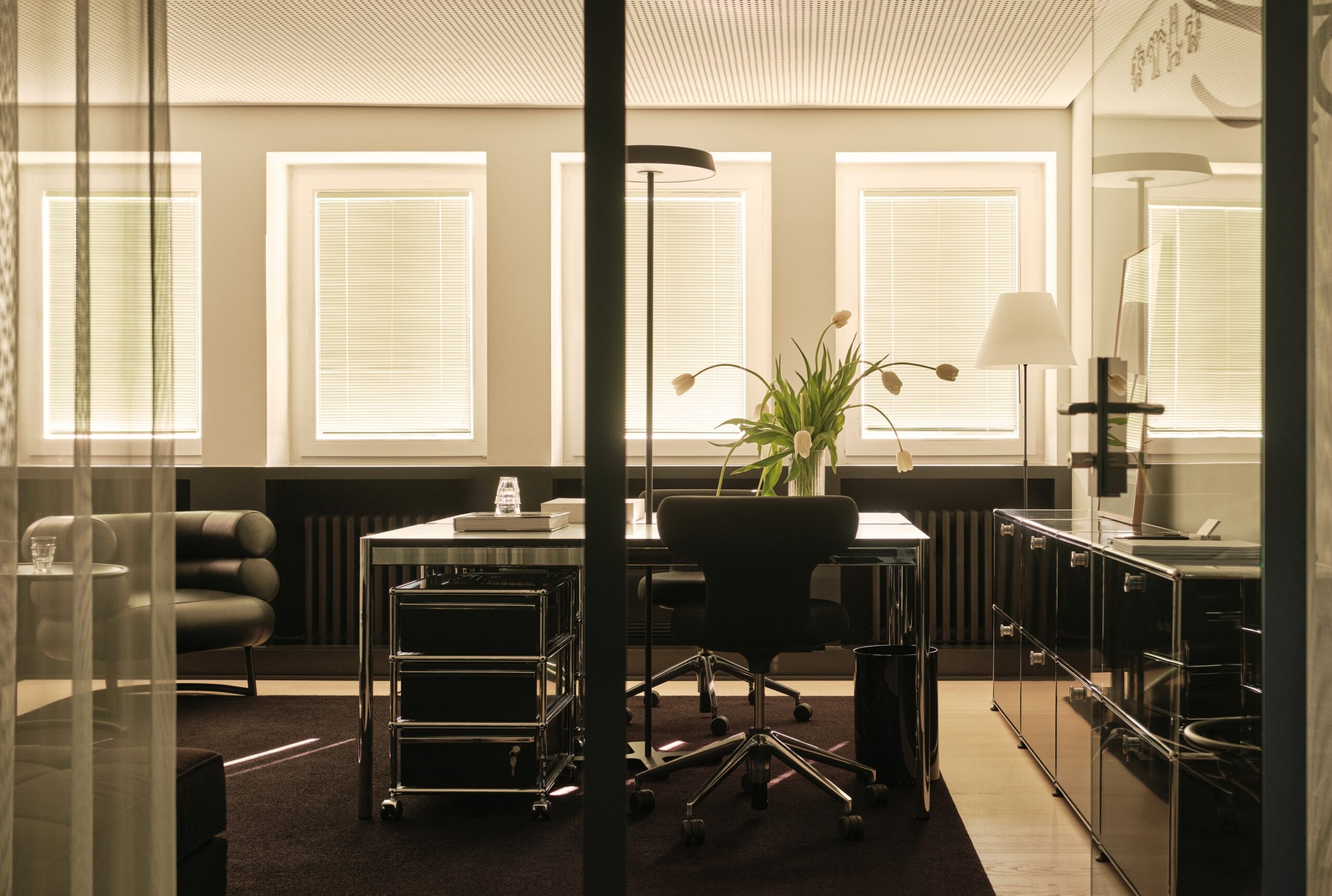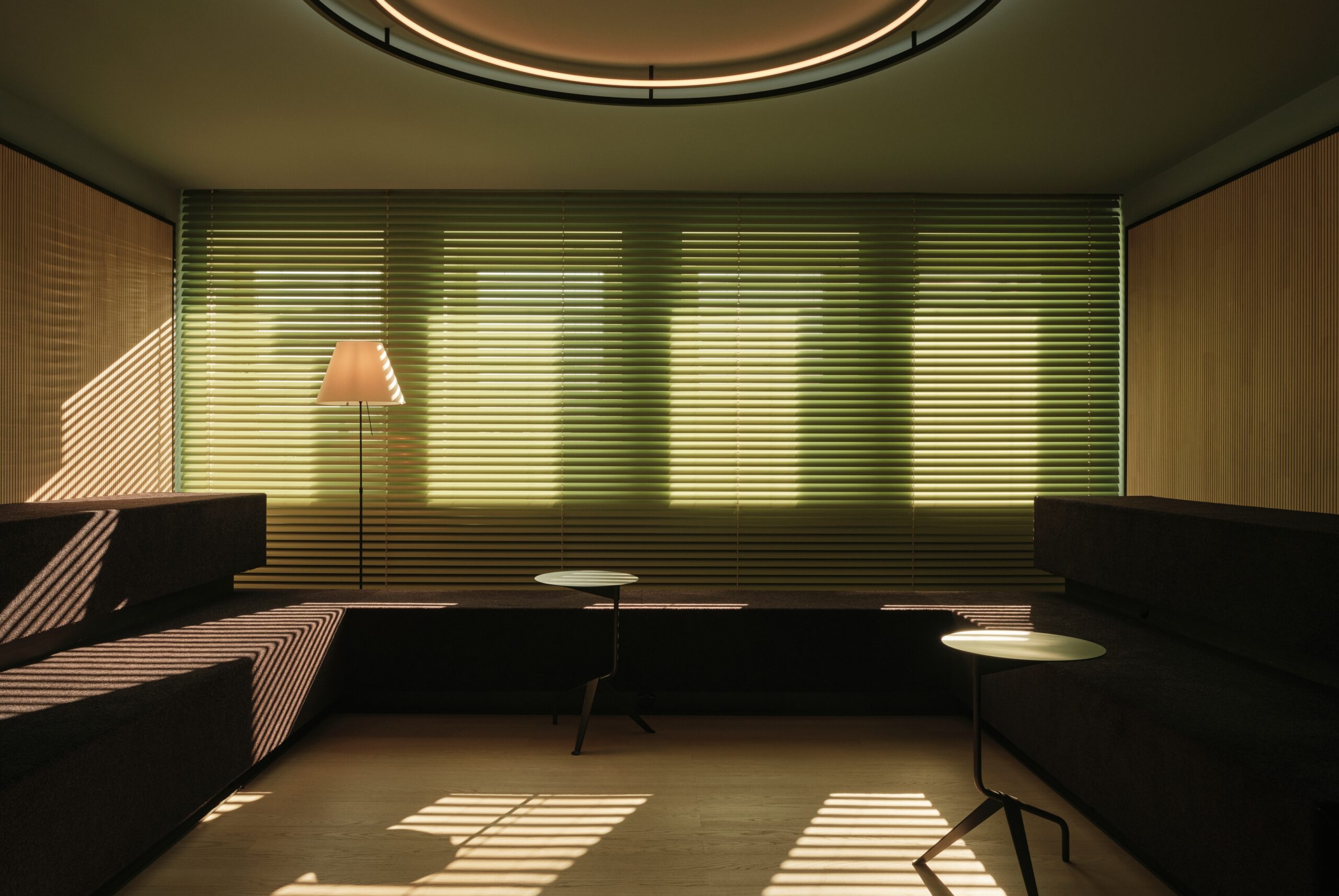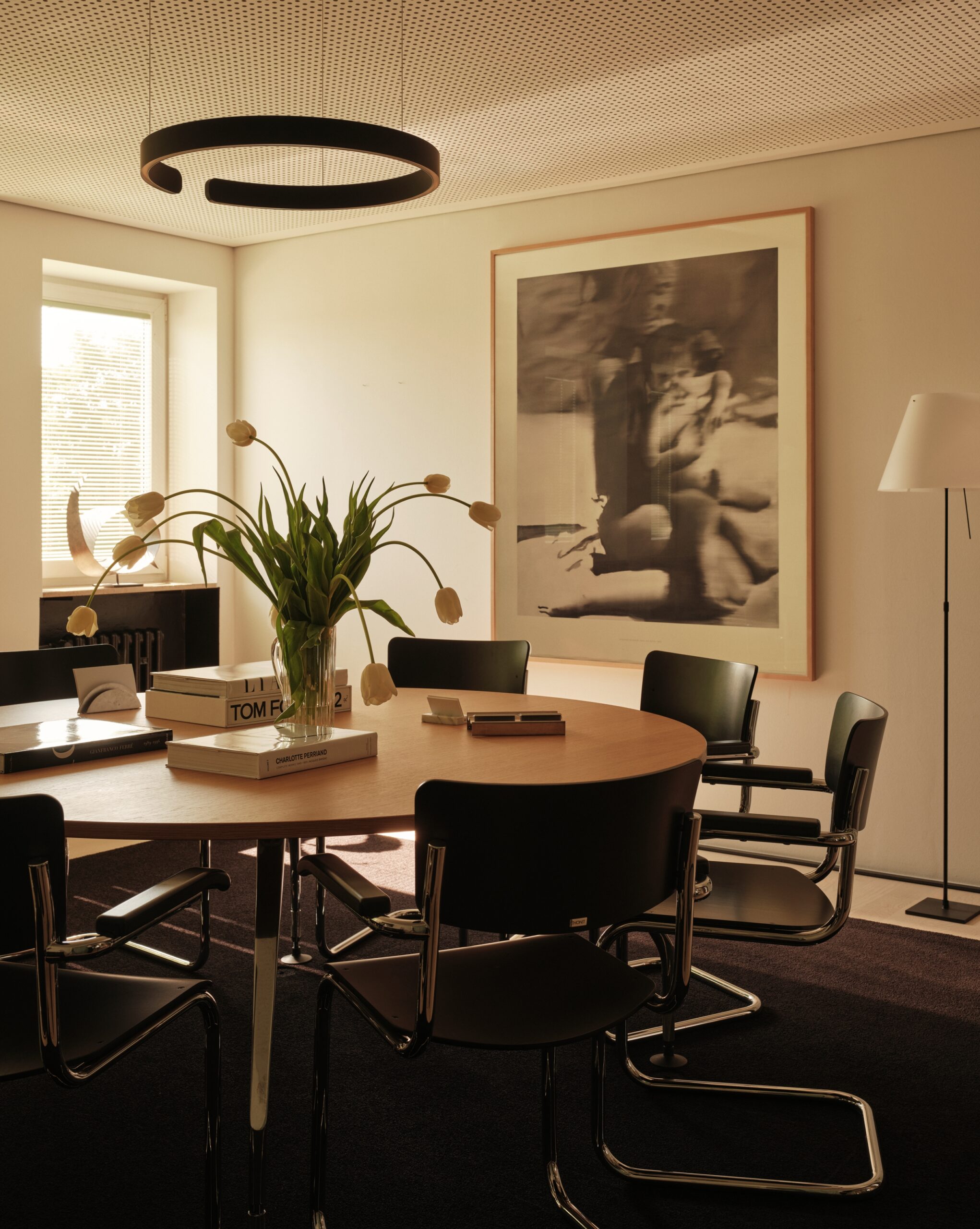 Every detail has been carefully considered. Interior blinds reduce glare while creating a subtle interplay between natural and artificial light, shifting the atmosphere throughout the day. A signature van den Valentyn touch – the right-angled arrangement of LC2 Le Corbusier chairs – blurs the line between work and social spaces, encouraging impromptu conversation. Acoustic ceiling and wall panels ensure optimal sound performance, while the lighting concept supports natural daylight and transitions to enhance comfort in the evening.